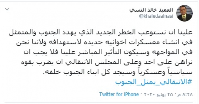وكتب "النسي" في تغريدة عبر حسابه بتويتر، رصدها "المشهد العربي": "علينا أن نستوعب الخطر الجديد الذي يهدد الجنوب والمتمثل في إنشاء معسكرات إخوانية جديدة لاستهدافه ولأننا نحن في المواجهة وسيكون التأثير المباشر علينا فلا يجب أن نراهن على أحد وعلى المجلس الانتقالي أن يضرب بقوة سياسيا وعسكريا وسيجد كل أبناء الجنوب خلفه".