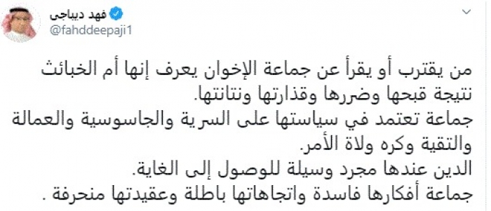 وقال في تغريدة عبر "تويتر" رصدها "المشهد العربي": "من يقترب أو يقرأ عن جماعة الإخوان يعرف إنها أم الخبائث نتيجة قبحها وضررها وقذارتها و.....".