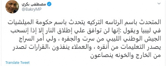 قال الإعلامي والبرلماني المصري مصطفى بكري، اليوم، إن المتحدث باسم الرئاسة التركية إبراهيم قالن يتحدث باسم حكومة المليشيات في ليبيا.