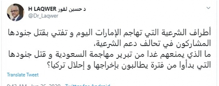 وقال في تغريدة عبر "تويتر" رصدها "المشهد العربي": "أطراف الشرعية التي تهاجم الإمارات اليوم وتفتي بقتل جنودها المشاركون في تحالف دعم الشرعية، ما الذي يمنعهم غدًا من تبرير مهاجمة السعودية وقتل جنودها التي بدأوا من فترة يطالبون بإخراجها وإحلال تركيا؟".
