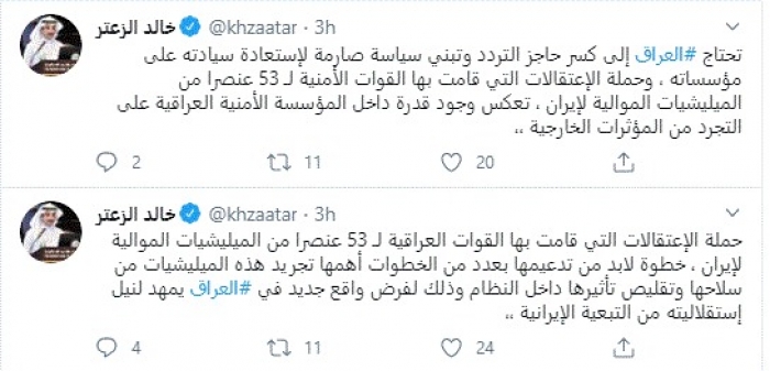 وقال في تغريدة عبر "تويتر" رصدها "المشهد العربي": "حملة الاعتقالات التي قامت بها القوات العراقية لـ 53 عنصرا من المليشيات الموالية لإيران، خطوة لا بد من تدعيمها بعدد من الخطوات أهمها تجريد هذه المليشيات من سلاحها وتقليص تأثيرها داخل النظام وذلك لفرض واقع جديد في العراق يمهد لنيل استقلاليته من التبعية الإيرانية".