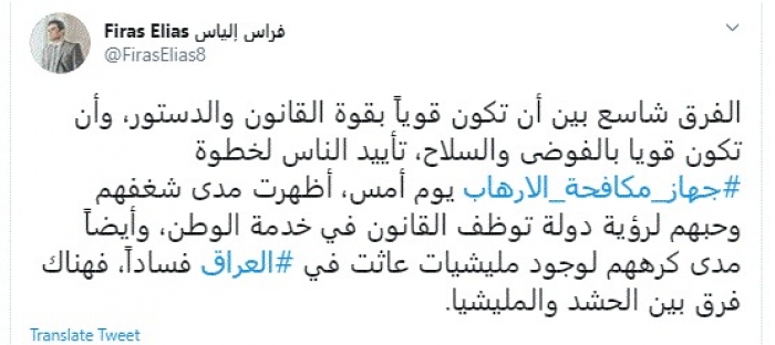 أشاد الباحث السياسي العراقي فراس إلياس، اليوم، بخطوة جهاز مكافحة الإرهاب بالعراق بالقبض على بعض عناصر المليشيات الإيرانية بالعراق.