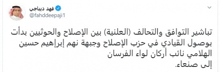 وقال في تغريدة عبر "تويتر" رصدها "المشهد العربي": "تباشير التوافق والتحالف (العلنية) بين الإصلاح والحوثيين بدأت بوصول القيادي في حزب الإصلاح وجبهة نهم إبرإهيم حسين الهلامي نائب أركان لواء الفرسان إلى صنعاء".
