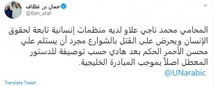 وقال في تغريدة عبر "تويتر" رصدها "المشهد العربي": "المحامي محمد ناجي علاو لديه منظمات إنسانية تابعة لحقوق الإنسان ويحرض على القتل بالشوارع مجرد أن يستلم علي محسن الأحمر الحكم بعد هادي حسب توصيفه للدستور المعطل أصلًا بموجب المبادرة الخليجية".