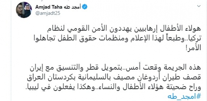 وقال في تغريدة عبر "تويتر" رصدها "المشهد العربي": "هؤلاء الأطفال إرهابيين يهددون الأمن القومي لنظام تركيا.. وطبعاً لهذا الإعلام ومنظمات حقوق الطفل تجاهلوا الأمر".