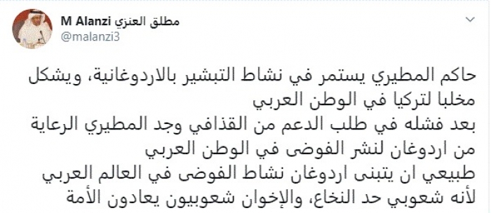 وقال في تغريدة عبر "تويتر" رصدها "المشهد العربي": "حاكم المطيري يستمر في نشاط التبشير بالأردوغانية، ويشكل مخلبا لتركيا في الوطن العربي بعد فشله في طلب الدعم من القذافي وجد المطيري الرعاية من أردوغان لنشر الفوضى في الوطن العربي".
