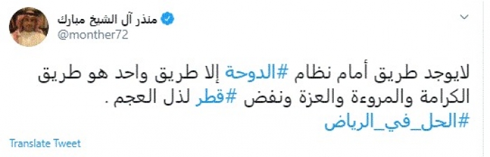 وقال في تغريدة عبر "تويتر" رصدها "المشهد العربي": "لايوجد طريق أمام نظام الدوحة إلا طريق واحد هو طريق الكرامة والمروءة والعزة ونفض قطر لذل العجم. الحل في الرياض".