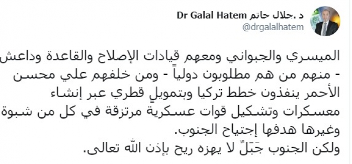 وكتب عبر تغريدة له على "تويتر" رصدها "المشهد العربي": "الميسري والجبواني ومعهم قيادات الإصلاح والقاعدة وداعش - منهم من هم مطلوبون دوليا - ومن خلفهم علي محسن الأحمر ينفذون خطط تركيا وبتمويل قطري عبر إنشاء معسكرات وتشكيل قوات عسكرية مرتزقة في كل من شبوة وغيرها هدفها اجتياح الجنوب، ولكن الجنوب جَبَلٌ لا يهزه ريح بإذن الله تعالى".