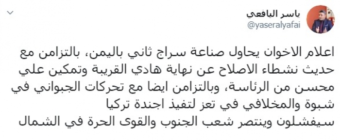 وكتب عبر تغريدة له على "تويتر" رصدها "المشهد العربي": إعلام الإخوان يحاول صناعة سراج ثاني باليمن، بالتزامن مع حديث نشطاء الإصلاح عن نهاية هادي القريبة وتمكين علي محسن من الرئاسة، وبالتزامن أيضا مع تحركات الجبواني في شبوة والمخلافي في تعز لتنفيذ أجندة تركيا، سيفشلون وينتصر شعب الجنوب والقوى الحرة في الشمال".