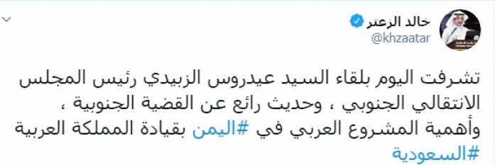 وكتب الزعتر عبر تغريدة له على "تويتر" رصدها "المشهد العربي": "تشرفت اليوم بلقاء السيد عيدروس الزُبيدي رئيس المجلس الانتقالي الجنوبي، وحديث رائع عن القضية الجنوبية، وأهمية المشروع العربي في اليمن بقيادة المملكة العربية السعودية".