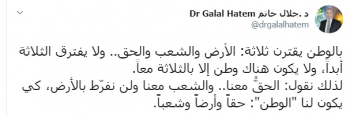 وكتب عبر تغريدة له على "تويتر" رصدها "المشهد العربي": "بالوطن يقترن ثلاثة، الأرض والشعب والحق، ولا يفترق الثلاثة أبدا، ولا يكون هناك وطن إلا بالثلاثة معا، لذلك نقول الحقُّ معنا والشعب معنا ولن نفرّط بالأرض، كي يكون لنا "الوطن"، حقا وأرضا وشعبا".