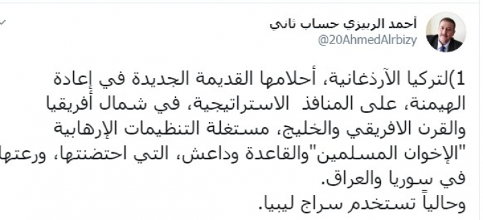 وكتب عبر تغريدة له على "تويتر" رصدها "المشهد العربي": "لتركيا الأروغانية، أحلامها القديمة الجديدة في إعادة الهيمنة، على المنافذ الاستراتيجية، في شمال أفريقيا والقرن الإفريقي والخليج، مستغلة التنظيمات الإرهابية "الإخوان المسلمين"والقاعدة وداعش، التي احتضنتها، ورعتها في سوريا والعراق، وحاليا تستخدم سراج ليبيا".