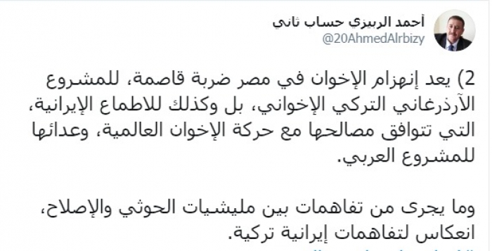 وأضاف: "يعد انهزام الإخوان في مصر ضربة قاصمة، للمشروع الآرذرغاني التركي الإخواني، بل وكذلك للأطماع الإيرانية، التي تتوافق مصالحها مع حركة الإخوان العالمية، وعدائها للمشروع العربي، وما يجرى من تفاهمات بين مليشيات الحوثي والإصلاح، انعكاس لتفاهمات إيرانية تركية".