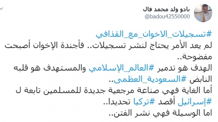 وكتب عبر تغريدة له على "تويتر" رصدها " المشهد العربي": "تسجيلات الإخوان مع القذافي لم يعد الأمر يحتاج لنشر تسجيلات، فأجندة الإخوان أصبحت مفضوحة، الهدف هو تدمير العالم الإسلامي والمستهدف هو قلبه النابض السعودية العظمى".