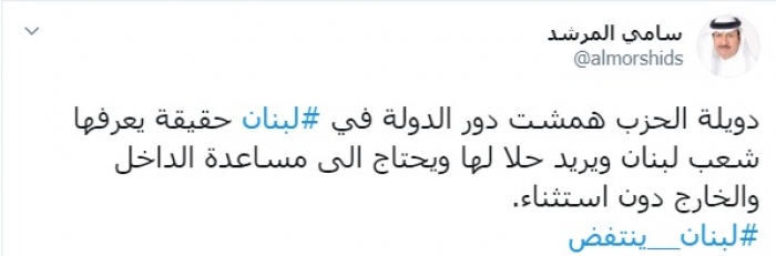 وكتب عبر تغريدة له على "تويتر" رصدها " المشهد العربي":"دويلة الحزب همشت دور الدولة في لبنان، حقيقة يعرفها شعب لبنان ويريد حلا لها ويحتاج إلى مساعدة الداخل والخارج دون استثناء".