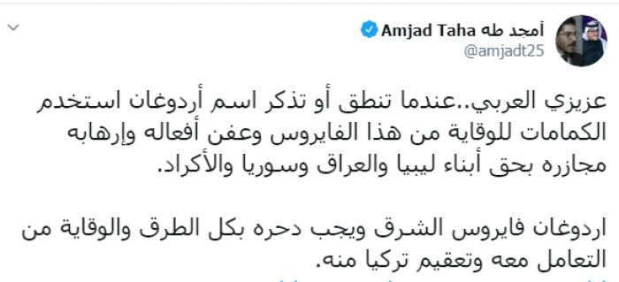 وكتب عبر تغريدة له على "تويتر" رصدها " المشهد العربي":عزيزي العربي، عندما تنطق أو تذكر اسم أردوغان استخدم الكمامات للوقاية من هذا الفايروس وعفن أفعاله وإرهابه مجازره بحق أبناء ليبيا والعراق وسوريا والأكراد".