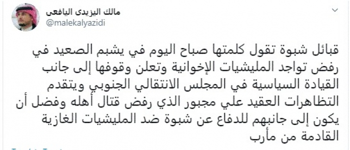 وقال في تغريدة عبر "تويتر" رصدها "المشهد العربي": "قبائل شبوة تقول كلمتها صباح اليوم في يشبم الصعيد في رفض تواجد المليشيات الإخوانية وتعلن وقوفها إلى جانب القيادة السياسية في المجلس الانتقالي الجنوبي".