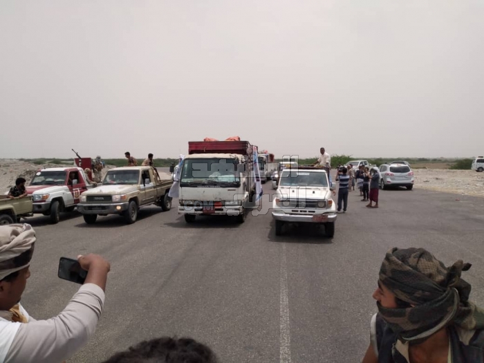 بقافلة غذائية.. قبيلة الجعوني بيافع تدعم جبهة أبين (صور)