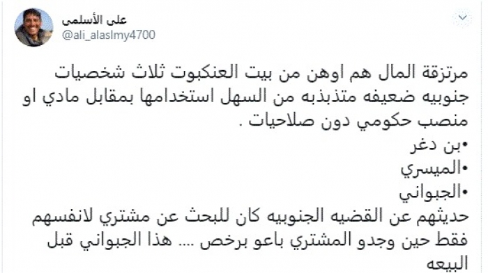 وقال في تغريدة عبر "تويتر" رصدها "المشهد العربي": "مرتزقة المال هم أوهن من بيت العنكبوت ثلاث شخصيات جنوبية ضعيفة متذبذبة من السهل استخدامها بمقابل مادي أو منصب حكومي دون صلاحيات".