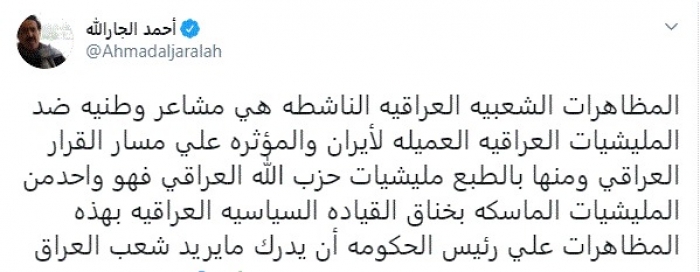 وأضاف: "ومنها بالطبع مليشيات حزب الله العراقي فهو واحد من المليشيات الماسكة بخناق القياة السياسية العراقية بهذه المظاهرات على رئيس الحكومه أن يدرك ما يريد شعب العراق".