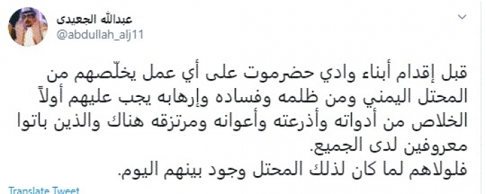 وقال في تغريدة عبر "تويتر" رصدها "المشهد العربي": "قبل إقدام أبناء وادي حضرموت على أي عمل يخلّصهم من المحتل اليمني ومن ظلمه وفساده وإرهابه يجب عليهم أولًا الخلاص من أدواته وأذرعته وأعوانه ومرتزقته هناك والذين باتوا معروفين لدى الجميع".
