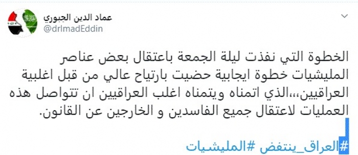 وقال في تغريدة عبر "تويتر" رصدها "المشهد العربي": "الخطوة التي نفذت ليلة الجمعة باعتقال بعض عناصر المليشيات خطوة إيجابية حظيت بارتياح عالي من قبل أغلبية العراقيين".