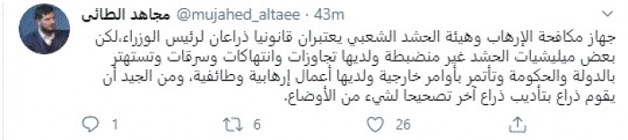 وقال في تغريدة عبر "تويتر" رصدها "المشهد العربي": "جهاز مكافحة الإرهاب وهيئة الحشد الشعبي يعتبران قانونيا ذراعان لرئيس الوزراء، لكن بعض ميليشيات الحشد غير منضبطة ولديها تجاوزات وانتهاكات وسرقات وتستهتر بالدولة والحكومة وتأتمر بأوامر خارجية ولديها أعمال إرهابية وطائفية".
