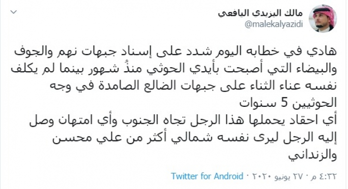 وكتب "اليافعي" في تغريدة عبر حسابه بتويتر، رصدها "المشهد العربي": "هادي في خطابه اليوم شدد على إسناد جبهات نهم والجوف والبيضاء التي أصبحت بأيدي الحوثي منذُ شهور بينما لم يكلف نفسه عناء الثناء على جبهات الضالع الصامدة في وجه الحوثيين 5 سنوات".