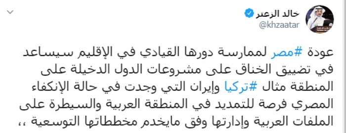وكتب عبر تغريدة له على "تويتر" رصدها " المشهد العربي":"عودة مصر لممارسة دورها القيادي في الإقليم سيساعد في تضييق الخناق على مشروعات الدول الدخيلة على المنطقة مثال تركيا وإيران التي وجدت في حالة الانكفاء المصري فرصة للتمديد في المنطقة العربية والسيطرة على الملفات العربية وإدارتها وفق ما يخدم مخططاتها التوسعية".