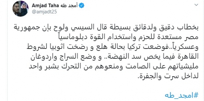 وقال في تغريدة عبر "تويتر" رصدها "المشهد العربي": "بخطاب دقيق ولدقائق بسيطة قال السيسي ولوح بإن جمهورية مصر مستعدة للحزم واستخدام القوة دبلوماسياً وعسكرياً".