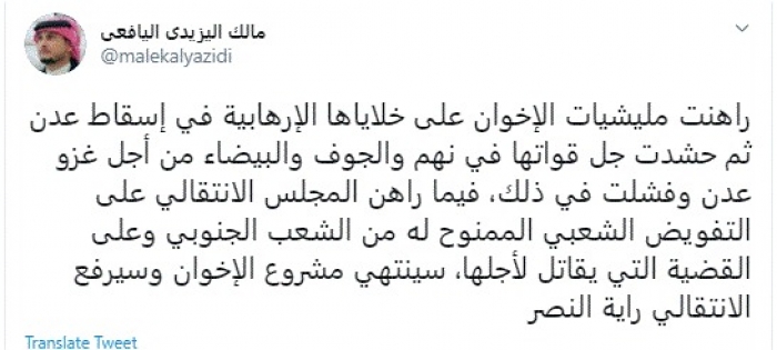 وكتب في تغريدة عبر "تويتر" رصدها "المشهد العربي": "راهنت مليشيات الإخوان على خلاياها الإرهابية في إسقاط عدن ثم حشدت جل قواتها في نهم والجوف والبيضاء من أجل غزو عدن وفشلت في ذلك".