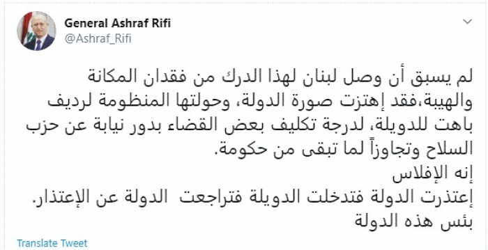 وقال في تغريدة عبر "تويتر" رصدها "المشهد العربي": "لم يسبق أن وصل لبنان لهذا الدرك من فقدان المكانة والهيبة، فقد اهتزت صورة الدولة، وحولتها المنظومة لرديف باهت للدويلة، لدرجة تكليف بعض القضاء بدور نيابة عن حزب السلاح وتجاوزاً لما تبقى من حكومة".
