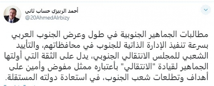 وكتب في تغريدة عبر "تويتر" رصدها "المشهد العربي": "مطالبات الجماهير الجنوبية في طول وعرض الجنوب العربي بسرعة تنفيذ الإدارة الذاتية للجنوب في محافظاتهم، والتأييد الشعبي للمجلس الانتقالي الجنوبي، يدل على الثقة التي أولتها الجماهير لقيادة الانتقالي باعتباره ممثل مفوض وأمين على أهداف وتطلعات شعب الجنوب، في استعادة دولته المستقلة".