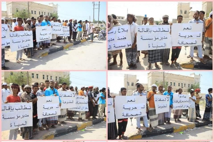 وطالبوا في الوقفة الاحتجاجية، بإقالة مدير مؤسسة المياه ومحاسبة المتسببين في إفشال مشاريع المياه وتقديم بلاغ جماعي ضد المؤسسة، ومنح الصحافة والصحفيين حرية التعبير عن الرأي كسلطة رقابية رابعة في المجتمع .