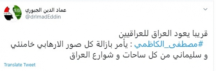 وقال في تغريدة عبر "تويتر" رصدها "المشهد العربي": "قريبا يعود العراق للعراقيين مصطفى الكاظمي: يأمر بإزالة كل صور الإرهابي خامنئي وسليماني من كل ساحات و شوارع العراق".