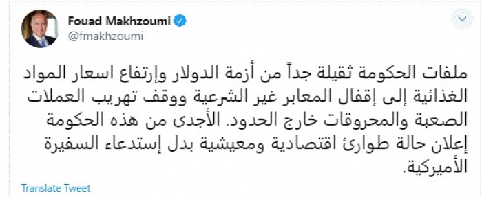 قال السياسي اللبناني البارز فؤاد مخزومي، اليوم، إن ملفات الحكومة اللبنانية ثقيلة جدًا، مُطالبًا بإعلان حالة طوارئ اقتصادية ومعيشية في لبنان.