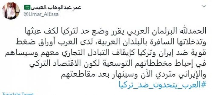 وكتب في تغريدة عبر "تويتر" رصدها "المشهد العربي": "الحمدلله البرلمان العربي يقرر وضع حد لتركيا لكف عبثها وتدخلاتها السافرة بالبلدان العربية، لدى العرب أوراق ضغط قوية ضد إيران وتركيا كإيقاف التبادل التجاري معهم".
