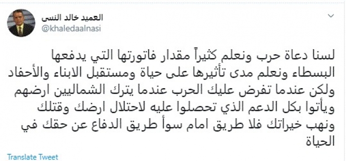 قال الكاتب والمحلل العسكري العميد خالد النسي، اليوم، إن أبناء الجنوب ليسوا دعاة الحرب ولكنهم يدافعون عن حقهم في الحياة ضد الطامعين في احتلال أرضهم.