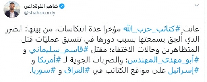 وكتب في تغريدة عبر "تويتر" رصدها "المشهد العربي": "عانت كتائب حزب الله مؤخراً عدة انتكاسات، من بينها: الضرر الذي أُلحِق بسمعتها بسبب دورها في تنسيق عمليّات قتل المتظاهرين وحالات الاختفاء".