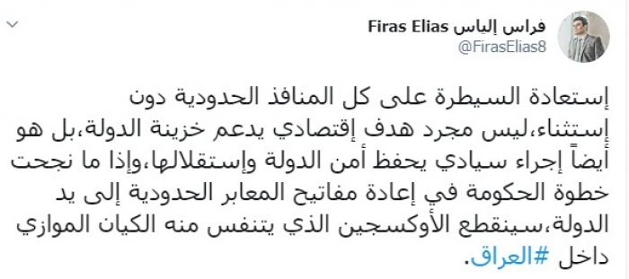 وكتب عبر تغريدة له على "تويتر" رصدها " المشهد العربي": "استعادة السيطرة على كل المنافذ الحدودية دون استثناء، ليس مجرد هدف اقتصادي يدعم خزينة الدولة، بل هو أيضاً إجراء سيادي يحفظ أمن الدولة واستقلالها، وإذا ما نجحت خطوة الحكومة في إعادة مفاتيح المعابر الحدودية إلى يد الدولة، سينقطع الأوكسجين الذي يتنفس منه الكيان الموازي داخل العراق".