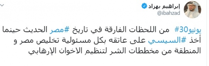 وكتب عبر تغريدة له على "تويتر" رصدها " المشهد العربي":"30يونيو من اللحظات الفارقة في تاريخ مصر الحديث حينما أخذ السيسي على عاتقه بكل مسئولية تخليص مصر و المنطقة من مخططات الشر لتنظيم الإخوان الإرهابي".