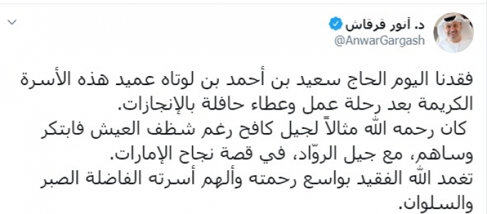 نعى وزير الدولة الإماراتي للشؤون الخارجية الدكتور أنور قرقاش، رحيل أحمد بن لوتاه والذي وافته المنية اليوم الأحد.