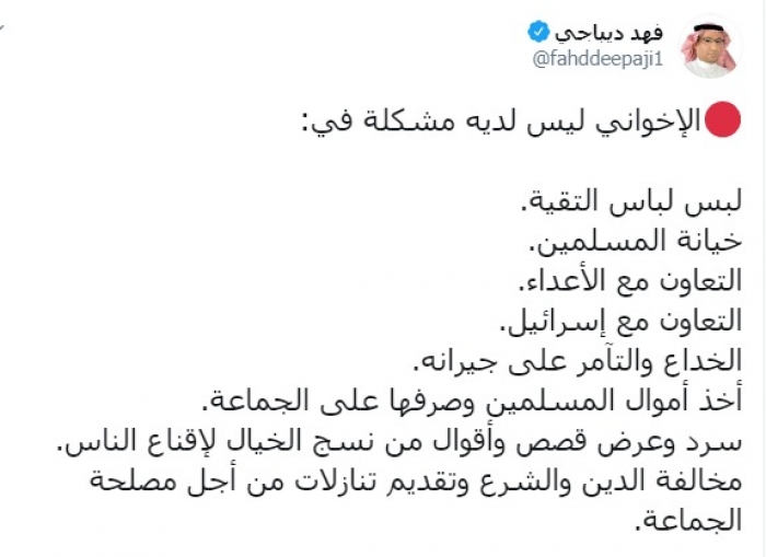 وكتب عبر تغريدة له على "تويتر" رصدها "المشهد العربي": "الإخواني ليس لديه مشكلة في، لبس لباس التقية، خيانة المسلمين، التعاون مع الأعداء، التعاون مع إسرائيل، الخداع والتآمر على جيرانه، أخذ أموال المسلمين وصرفها على الجماعة، سرد وعرض قصص وأقوال من نسج الخيال لإقناع الناس، مخالفة الدين والشرع وتقديم تنازلات من أجل مصلحة الجماعة".