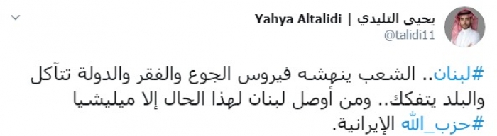 وكتب عبر تغريدة له على "تويتر" رصدها " المشهد العربي":"لبنان الشعب ينهشه فيروس الجوع والفقر والدولة تتآكل والبلد يتفكك، ومن أوصل لبنان لهذا الحال إلا مليشيا حزب الله الإيرانية".