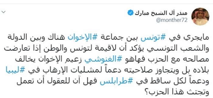 وكتب عبر تغريدة له على "تويتر" رصدها " المشهد العربي": "ما يجري في تونس بين جماعة الإخوان هناك وبين الدولة والشعب التونسي يؤكد أن لا قيمة لتونس والوطن إذا تعارضت مصالحه مع الحزب فها هو الغنوشي زعيم الإخوان يخالف بلاده بل ويتجاوز صلاحيته دعماً لمليشيات الإرهاب في ليبيا ودعماً لكل ساقط في طرابلس فهل آن للعقول أن تعمل وتجتث هذا الحزب؟".