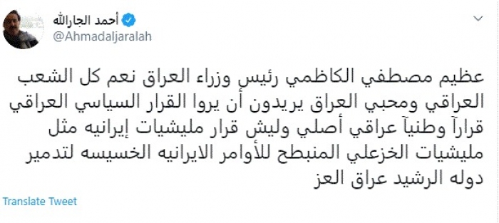 الجارالله مُشيدًا بالكاظمي: قراراته عظيمة ويتصدى لمليشيات إيران