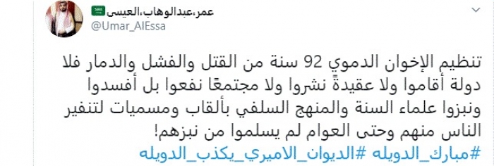 هاجم الكاتب والمحلل السياسي السعودي عمر عبدالوهاب العيسى، اليوم، تنظيم الإخوان الإرهابي، واصفًا إياه بالتنظيم الدموي.