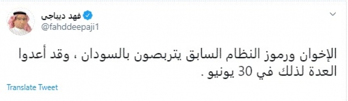 وقال في تغريدة عبر "تويتر" رصدها "المشهد العربي": "الإخوان ورموز النظام السابق يتربصون بالسودان، وقد أعدوا العدة لذلك في 30 يونيو".
