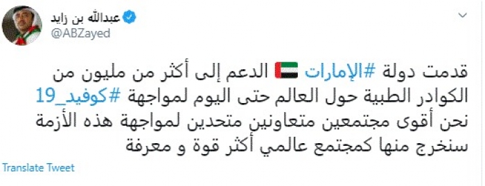 وكتب في تغريدة عبر "تويتر" رصدها "المشهد العربي": "قدمت دولة الإمارات الدعم إلى أكثر من مليون من الكوادر الطبية حول العالم حتى اليوم لمواجهة كوفيد 19".