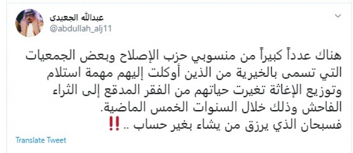وقال في تغريدة عبر "تويتر" رصدها "المشهد العربي": "هناك عددًا كبيرًا من منسوبي حزب الإصلاح وبعض الجمعيات التي تسمى بالخيرية من الذين أوكلت إليهم مهمة استلام وتوزيع الإغاثة تغيرت حياتهم من الفقر المدقع إلى الثراء الفاحش وذلك خلال السنوات الخمس الماضية".